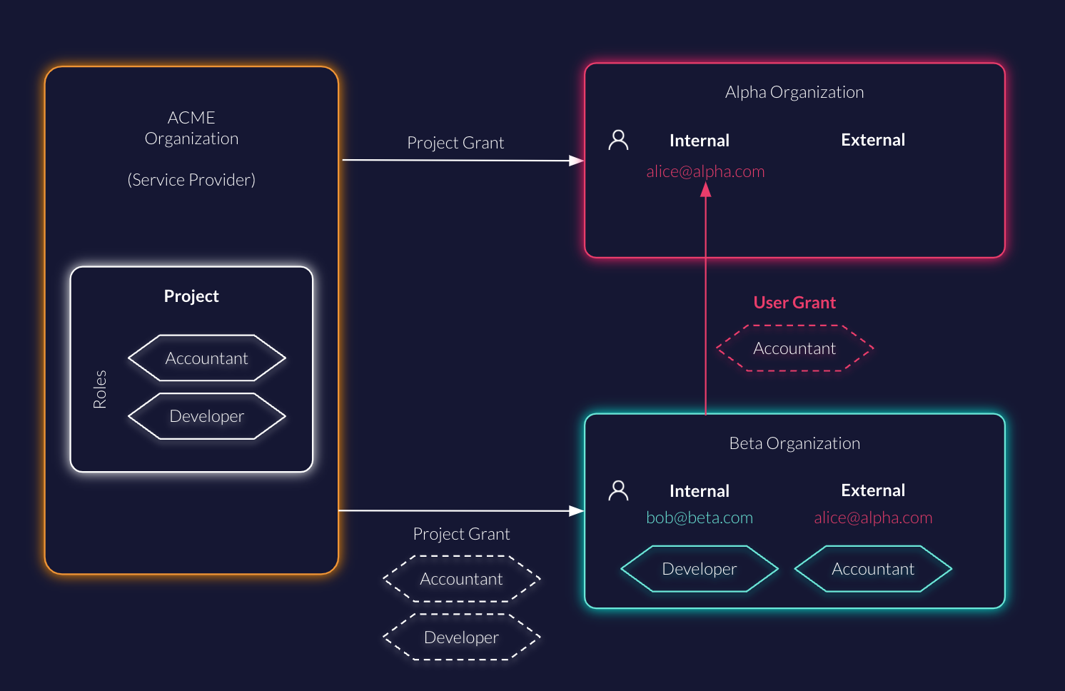 Project grants are used to delegate access management of an entire project (or specific roles of the project) to another organization.